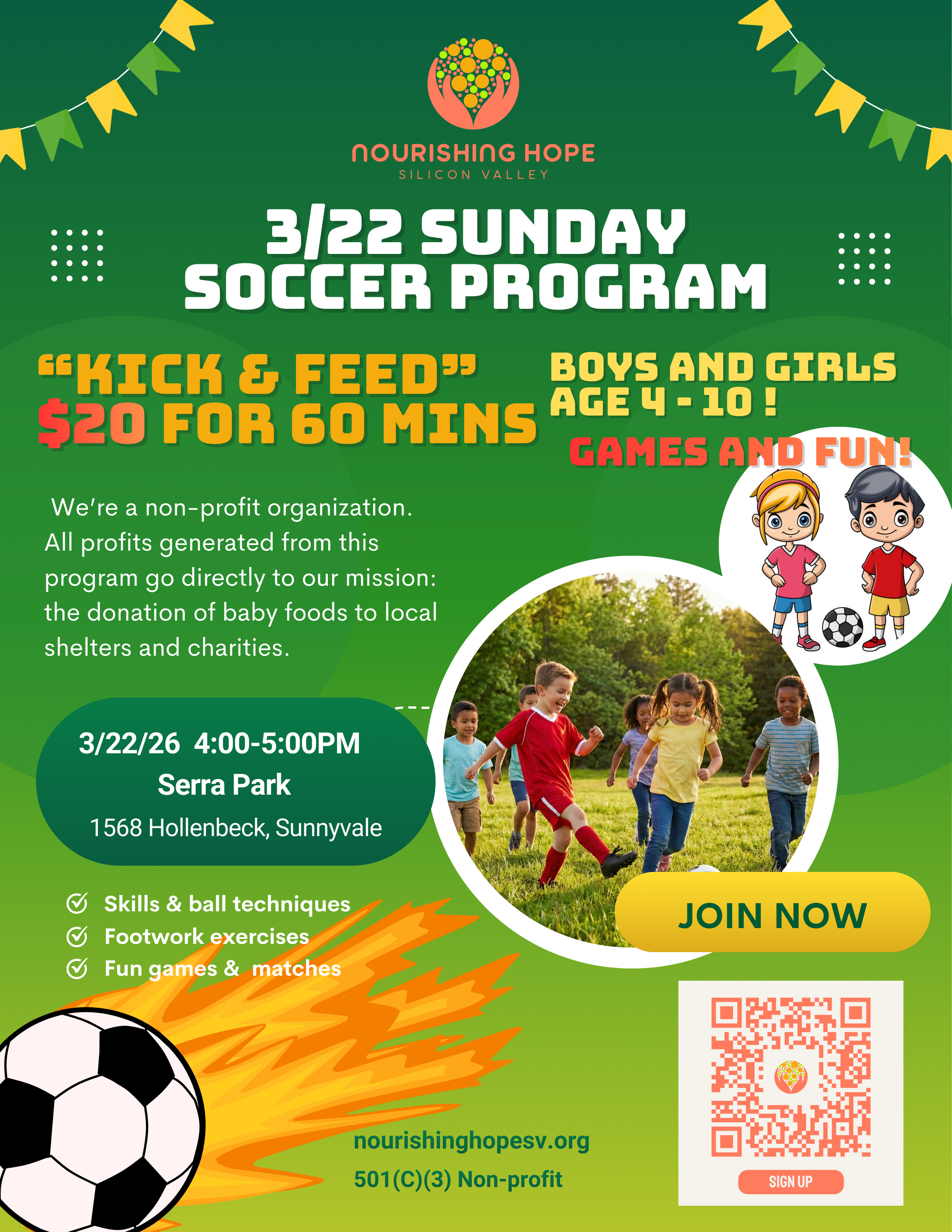 Nourishing Hope Silicon Valley invites families to join our upcoming community soccer training at Serra Park in Sunnyvale. Led by our passionate young coaches, the session focuses on building soccer skills, teamwork, and confidence while making the game fun for kids of all levels. All proceeds support our nonprofit mission of donating high-quality baby food to local shelters and low-income families.