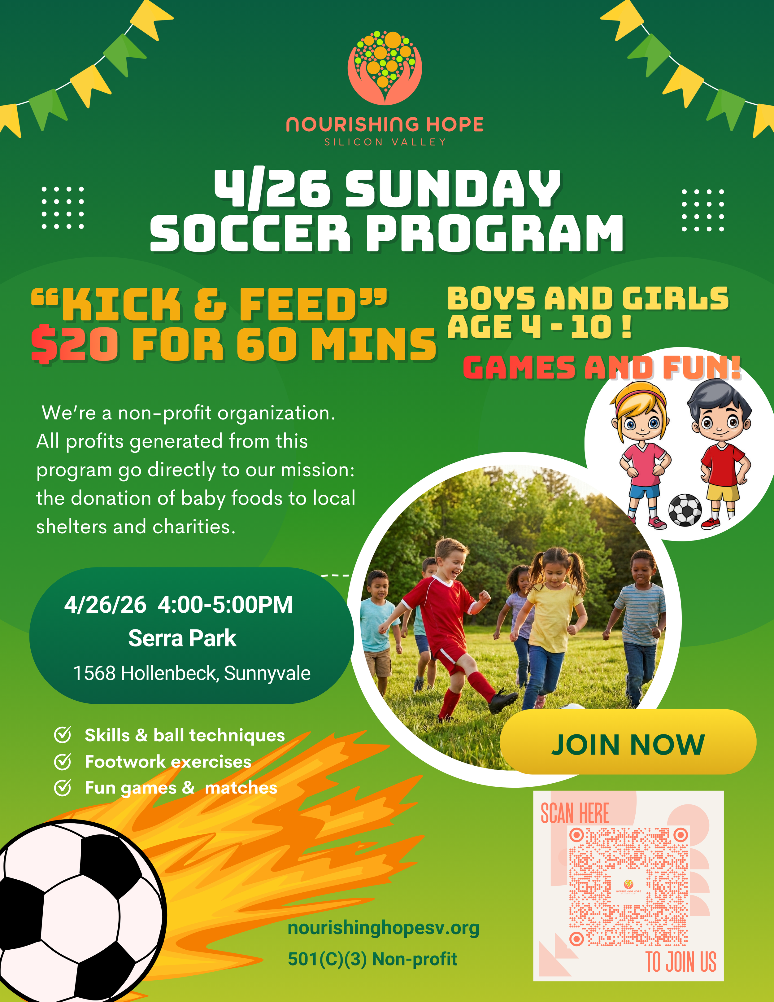 Our Sunday Soccer Program is back this April, bringing energy, teamwork, and joy to the field! Designed for kids of all skill levels, each session focuses on building fundamental soccer skills through fun drills, small-sided games, and plenty of scrimmage time. Led by our passionate youth coaches, the program not only helps children grow in confidence and teamwork but also supports our nonprofit mission to provide nutritious food to families in need. Come join us for a meaningful and active Sunday!
